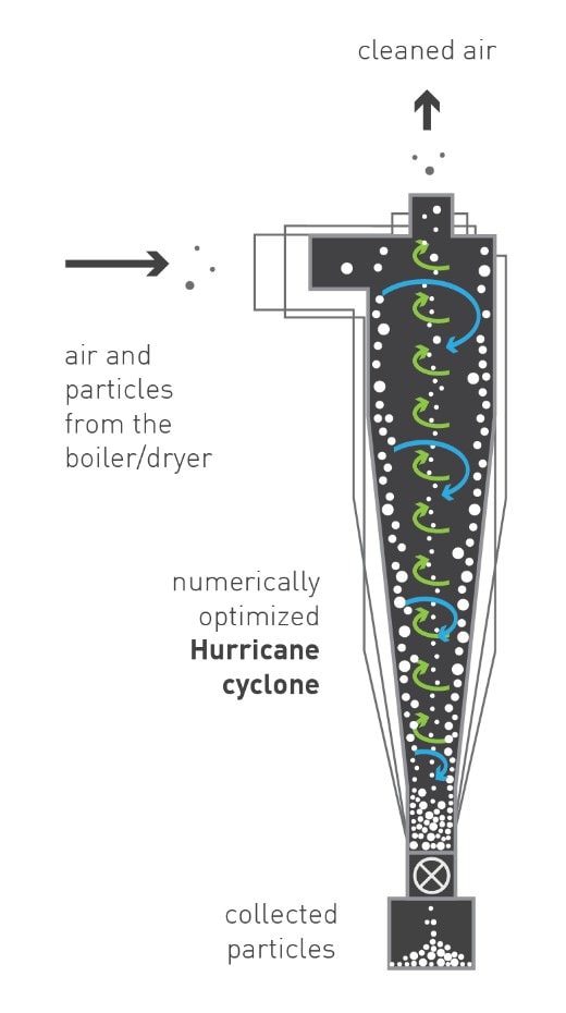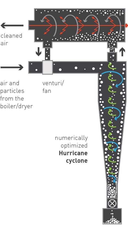 Hurricane cyclone geometries, with the possibility of recirculation (ReCyclone Systems), have proven to be an alternative to ESPs and BFs in numerous plants all over the world to comply with strict limits, reaching emissions as low as 30 mg/Nm³.