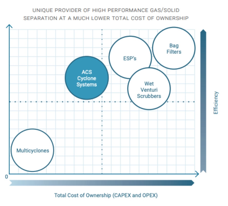 Depending on the requirements of the client, ACS designs solutions that go from compact pre-separators to a final stage dust collector. The more efficient the solution is, the larger the number of cyclones needed to increase residence time and promote particle agglomer- ation. ACS offers the most cost-efficient solutions by considering the impact of space and cost.